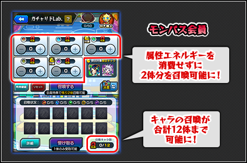 モンパス会員は、「ガチャリドLab.」で属性エネルギーを消費せずに、好きな属性のキャラクターを2体分召喚可能に!